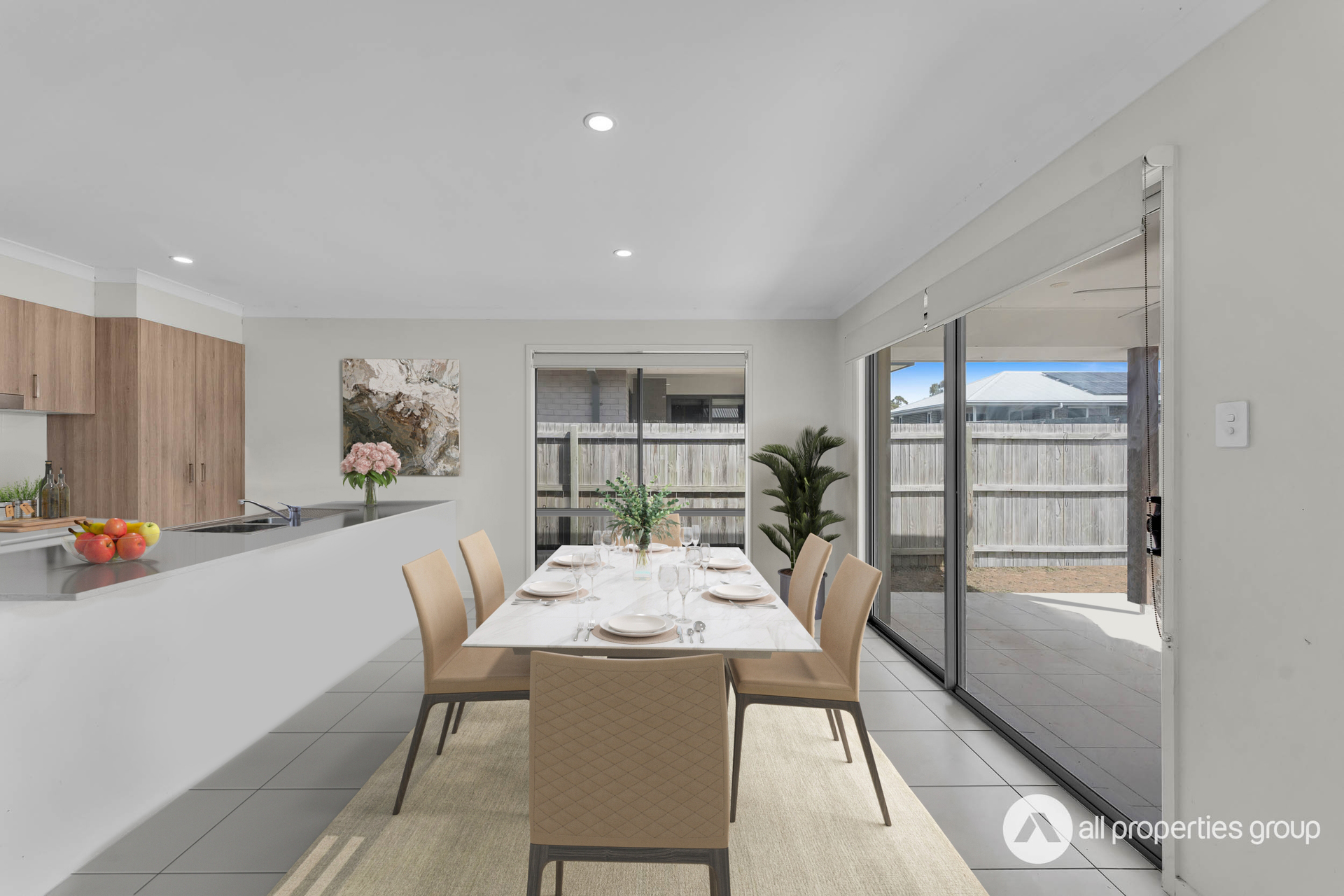 The kitchen, equipped with a sleek stone benchtop and ample cabinetry, offers both functionality and style. Its layout is ideal for those who enjoy cooking and entertaining, as it seamlessly flows into the dining area, making meal preparation and serving more efficient. This design also creates a visual connection to the outdoor alfresco space, perfect for hosting gatherings or enjoying casual family dinners.