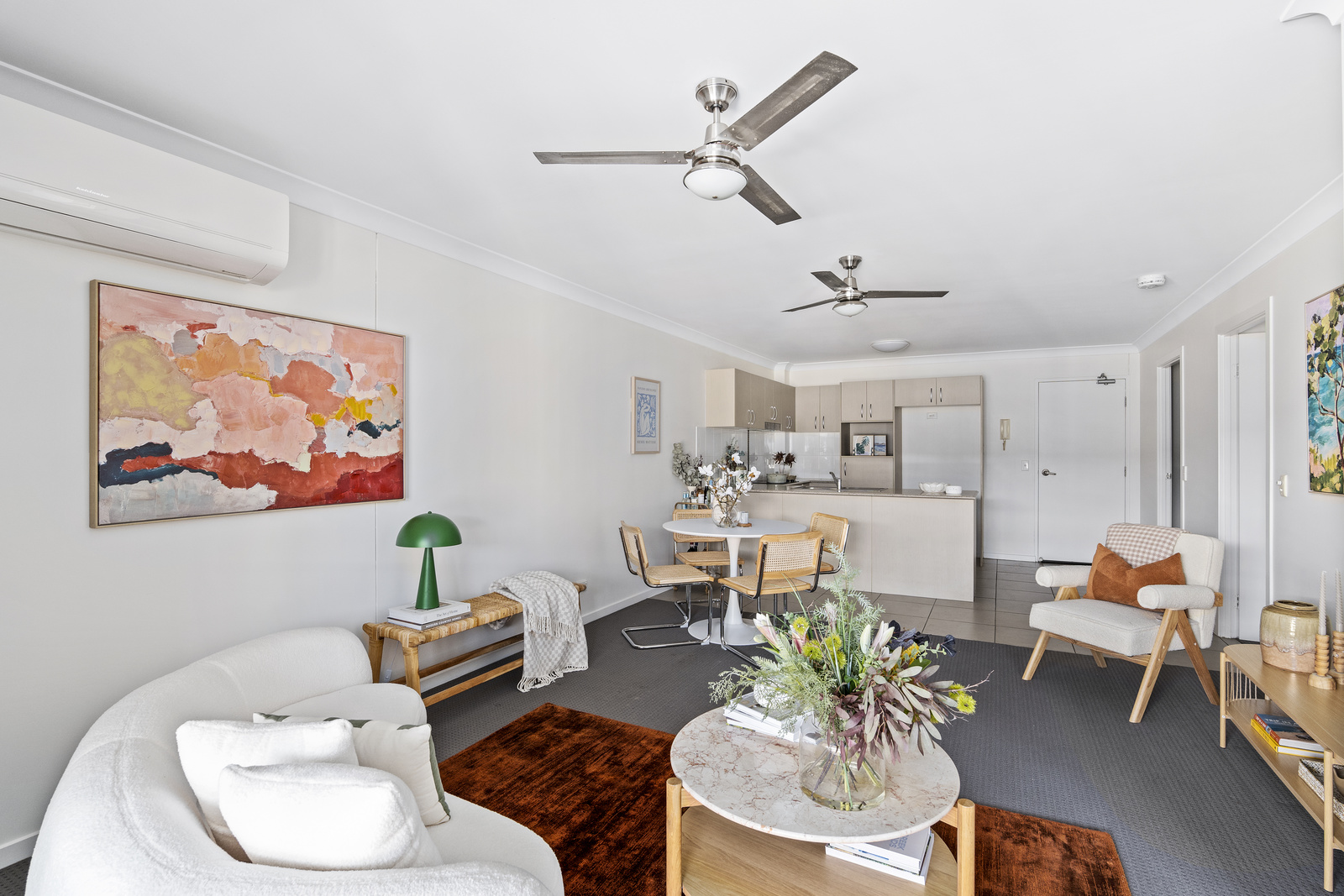 • 2 Bedrooms: Both bedrooms are equipped with air conditioning, ceiling fans, and built-in wardrobes for your comfort. • Open Plan Kitchen, Living & Dining: The heart of the home features an open-plan design, perfect for entertaining and everyday living. • Modern Kitchen: Includes an oven, dishwasher, stovetop, overhead rangehood, and ample storage. • Air Conditioning: Stay cool and comfortable year-round with air conditioning in the living area and bedrooms. • Ceiling Fans Throughout: Ensures a pleasant breeze in every room. • Bathroom: Features a toilet, single vanity, and a shower over the bathtub. • Private Balcony: A lovely space to relax and enjoy your morning coffee or evening sunset. • Separate Laundry Room: Adds to the convenience and functionality of this home. • Single Carspace: Secure parking in the complex for your peace of mind.